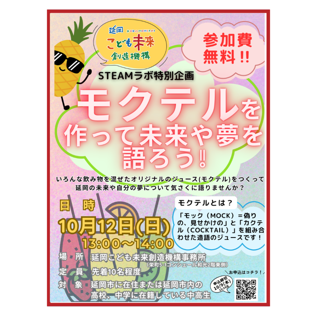 10月12日(日)にSTEAMラボの特別企画として、中高生のみなさんを対象に、オリジナルのジュース=「モクテル」をつくって、「自分の夢」や「こうだったらいいな=ありたい姿」について語り合うイベントを開催します!「気になる […]