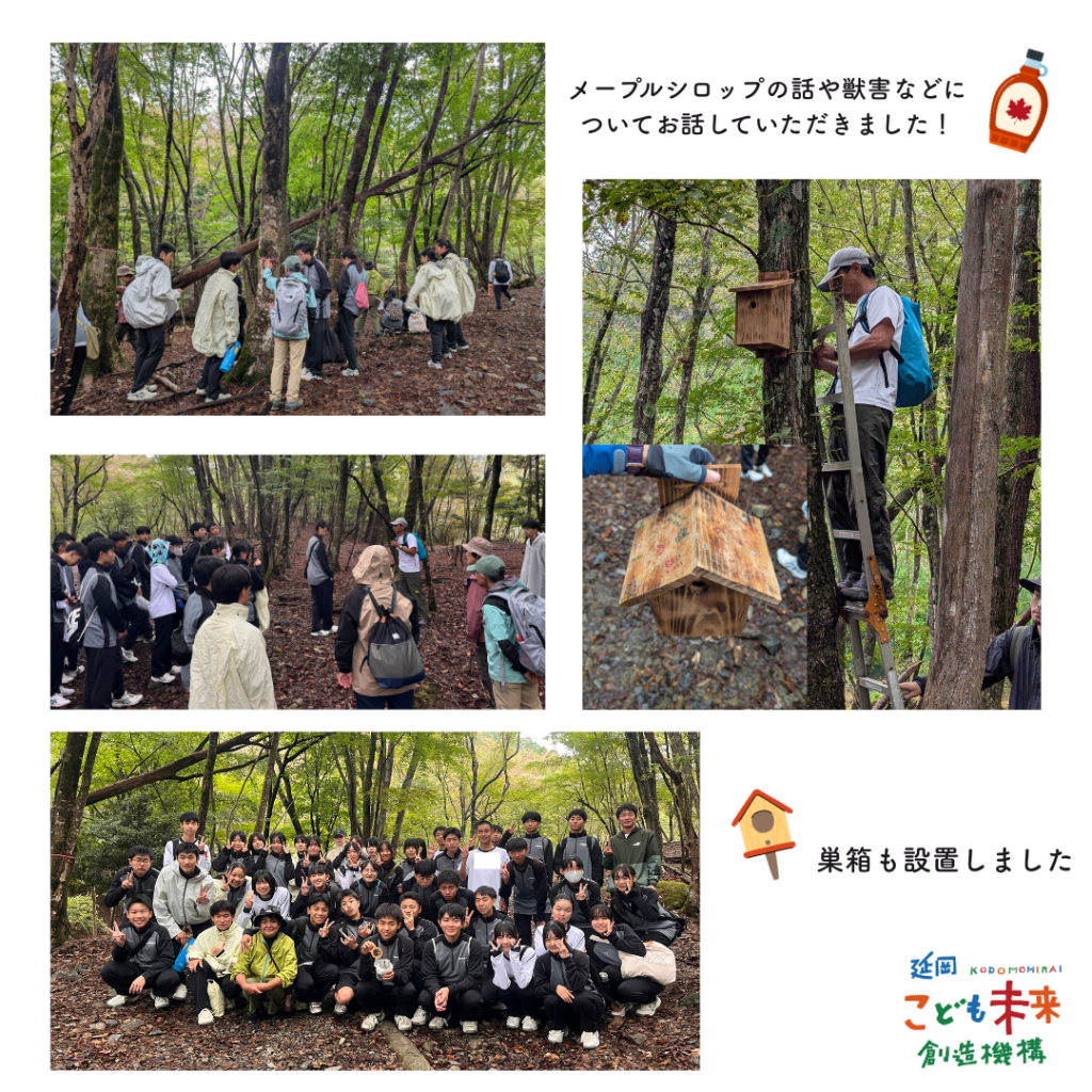 午前中は全員で鬼の目林道を訪れ、メープルシロップ作りの行程や鹿による食害が植物に与える影響など、貴重なお話を伺いました。その後、生徒全員で鳥の巣箱に「鬼の目林道を訪れた証」を記し、鬼の目林道の木に設置しました✨