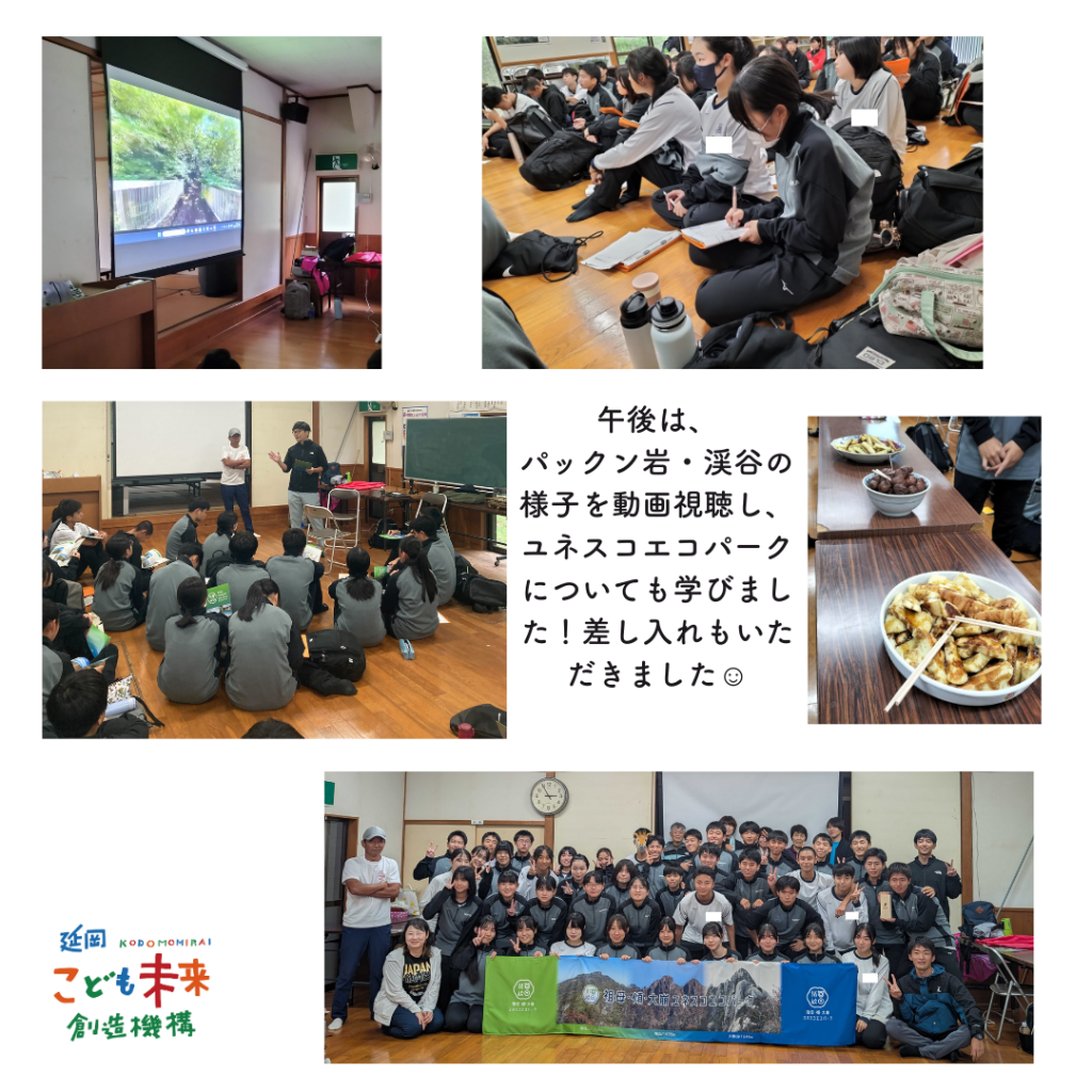午後は、訪れることができなかったパックン岩や渓谷の様子を動画で視聴しながら、ユネスコエコパークに認定されている鹿川地域の魅力や課題について考え、振り返りを行いました。また、フォレスト・マントル上鹿川の西様より、メープルシロップなど鹿川らしいおやつの差し入れをいただき、生徒たちも大喜びでした👏