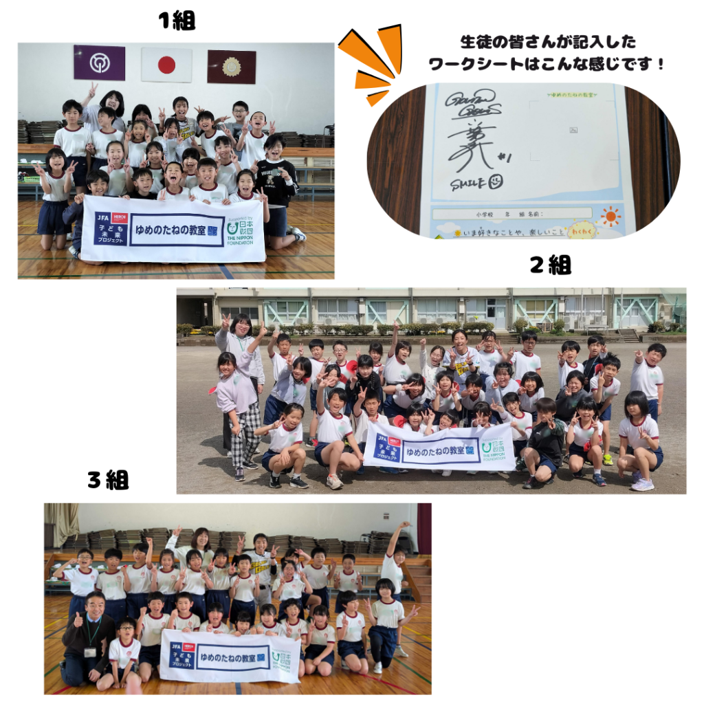 夢先生からは「好きという気持ちをすごく大切にしてもらいたい」などの熱いメッセージがあり、子どもたちからは「友達に言われたらうれしい言葉をもっと使おうと思った」「夢は陸上選手、夢先生みたいに私もやってみたい」など、前向きで意欲のある感想が聞かれ、夢先生のメッセージをしっかりと受け止めていました。子どもたちが自分の好きなことや楽しいこと、言われて嬉しいこと、今日感じたことを記入したワークシートには、夢先生が一人ずつサインをしてくださいました🎀