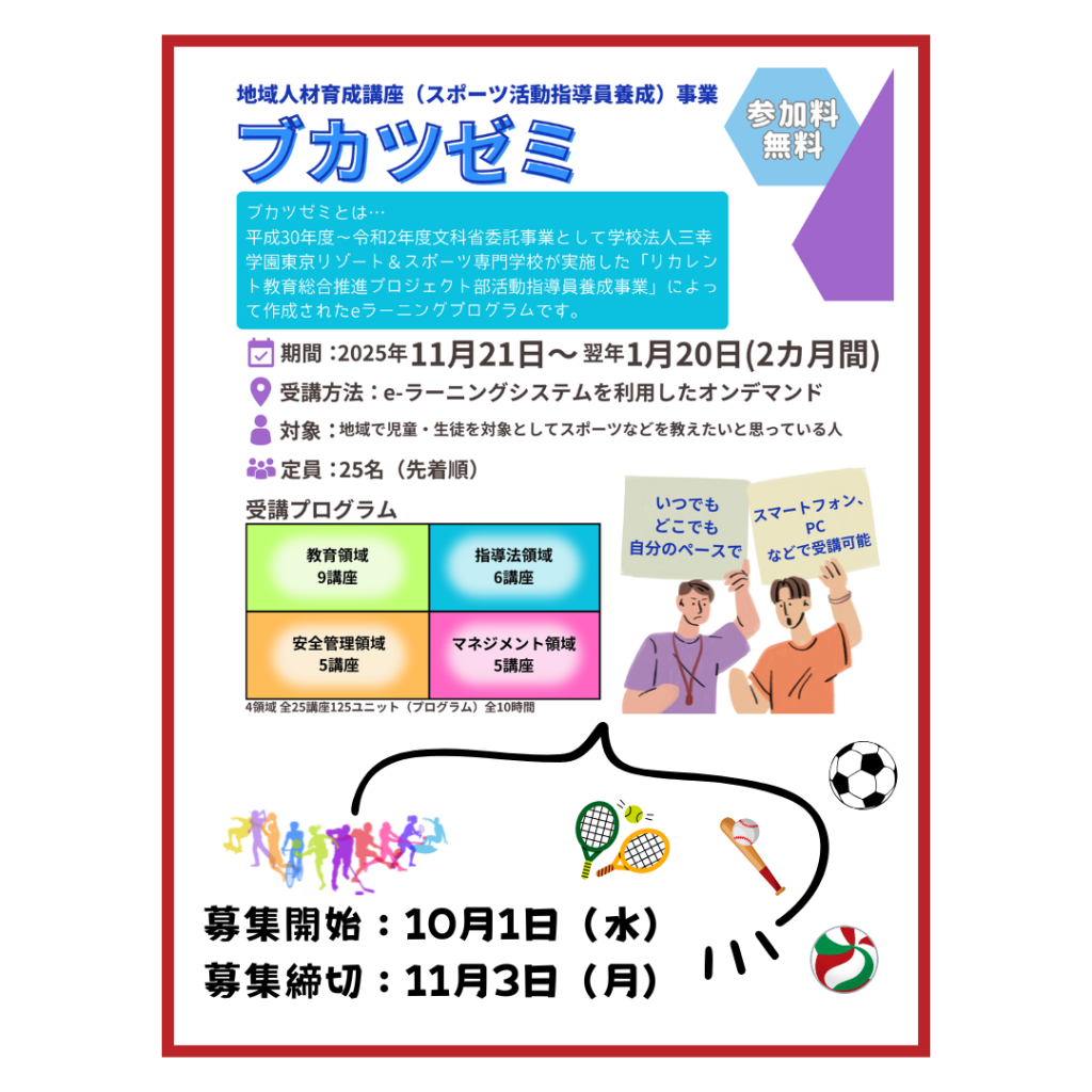 令和7年11月21日~翌年1月20日までの2か月間、「ブカツゼミ」を開講します! 「ブカツゼミ」とは、学校法人三幸学園が文部科学省からの委託を受けて開発した人材育成プログラムです。eラーニングシステムを活用して、学校